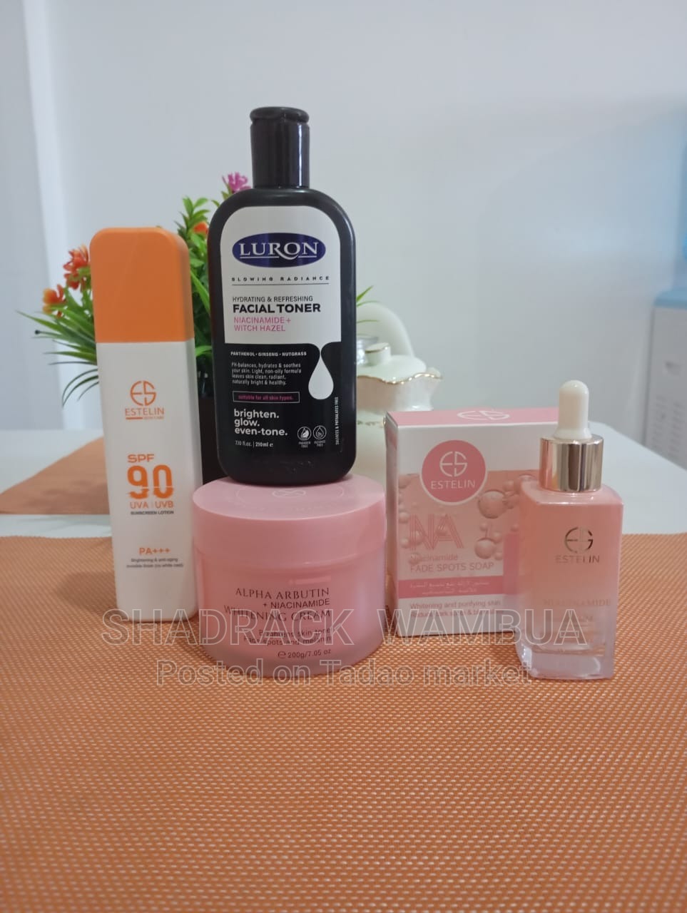 Tadao Market-Includes: 1. Niacinamide face soap 2. Luron face toner 3. Niacinamide super serum 4. Estelin alpha arbutin moisturizing cream 5. Brightening sunscreen
